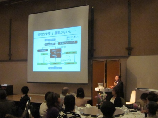 今回の勉強会では、城内六島クリニック山本院長より、『(下肢および体幹の)筋肉を落とさないために-運動と食事-』とのタイトルで、寝たきりにならない、また介護度をあげないためには、適切な運動と食事が大切との話がありました。