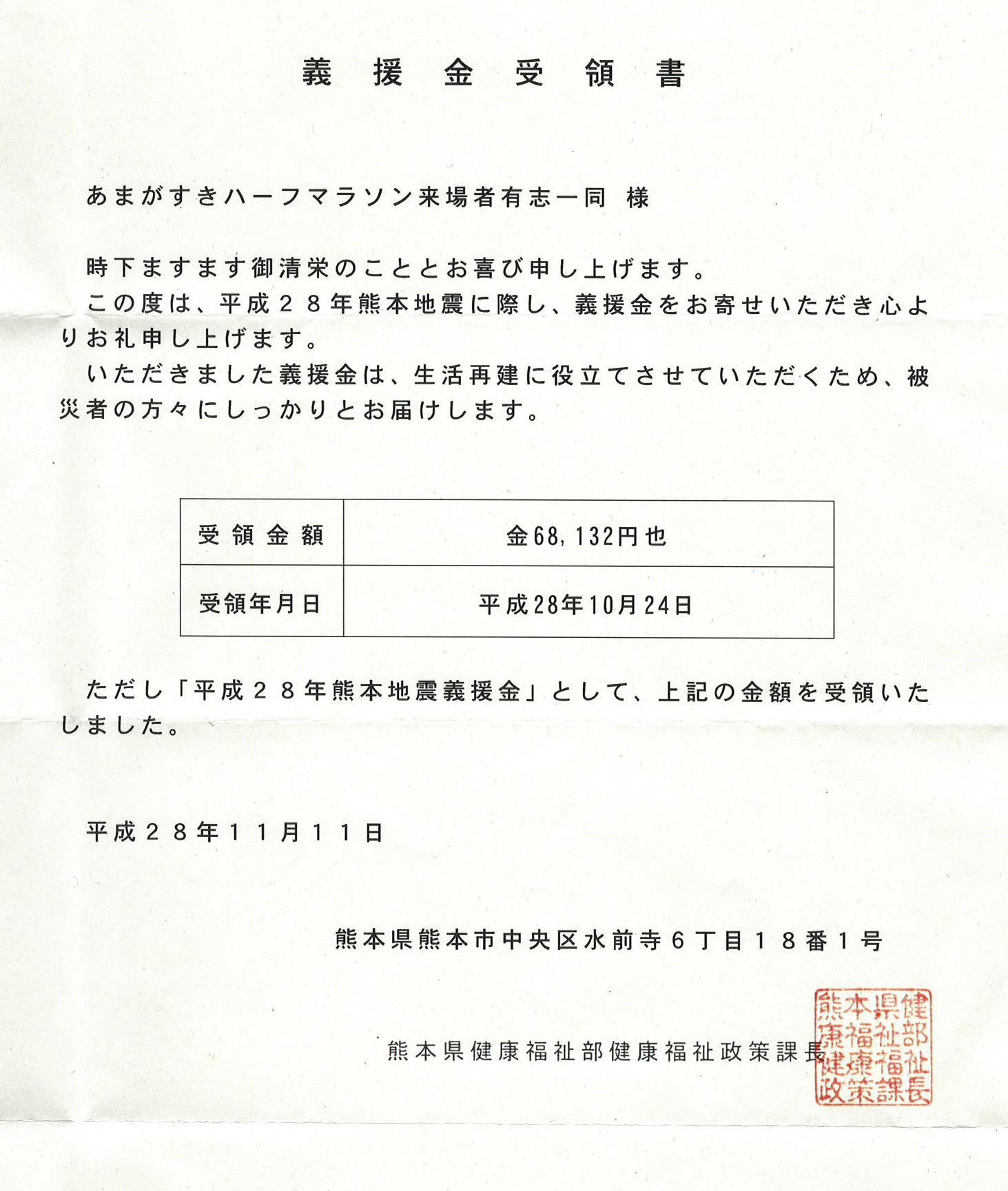 10月16日(日) 六島クリニックは、「 尼崎市市制100周年記念あまがすきハーフマラソン」の協賛企業として会場ブースに於いて「熊本地震支援募金活動」を実施しました。ご来場頂いた皆様から頂きました義援金「68,132円」は、10月24日に熊本県健康福祉部健康福祉政策課を通じて熊本で被災された方々の生活再建にお役立て頂くこととなりました。ご支援いただきました皆様には心から感謝申し上げます。また当日は天候にも恵まれ約7000名のランナーが尼崎の工場地帯から森、海、運河、河川など豊かな自然を楽しみながら駆け抜け、六島クリニックからも4名のランナーが参加して完走しました。