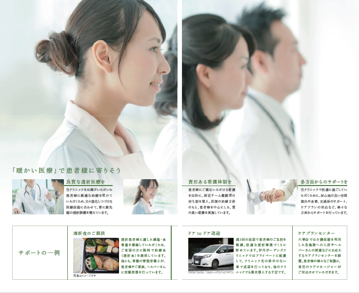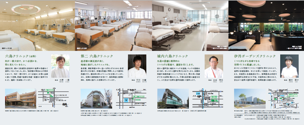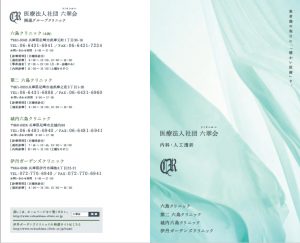医療法人社団 六翠会 のパンフレットが新しくなりました。表紙には柔らかいカーテンをモチーフに「患者様の毎日に、暖かい医療を」のタイトルが六翠会の想いを表現しています。中綴じには、人物を強くアピールしながら「暖かい医療で患者様に寄りそう」というスタッフの想いや取り組みが書かれています。大開きと裏面には、六島クリニック、第二六島クリニック、城内六島クリニック、伊丹ガーデンズクリニックを写真入りで紹介しています。パンフレットは各クリニックの受付に置いてありますので一度お手に取ってご覧ください。